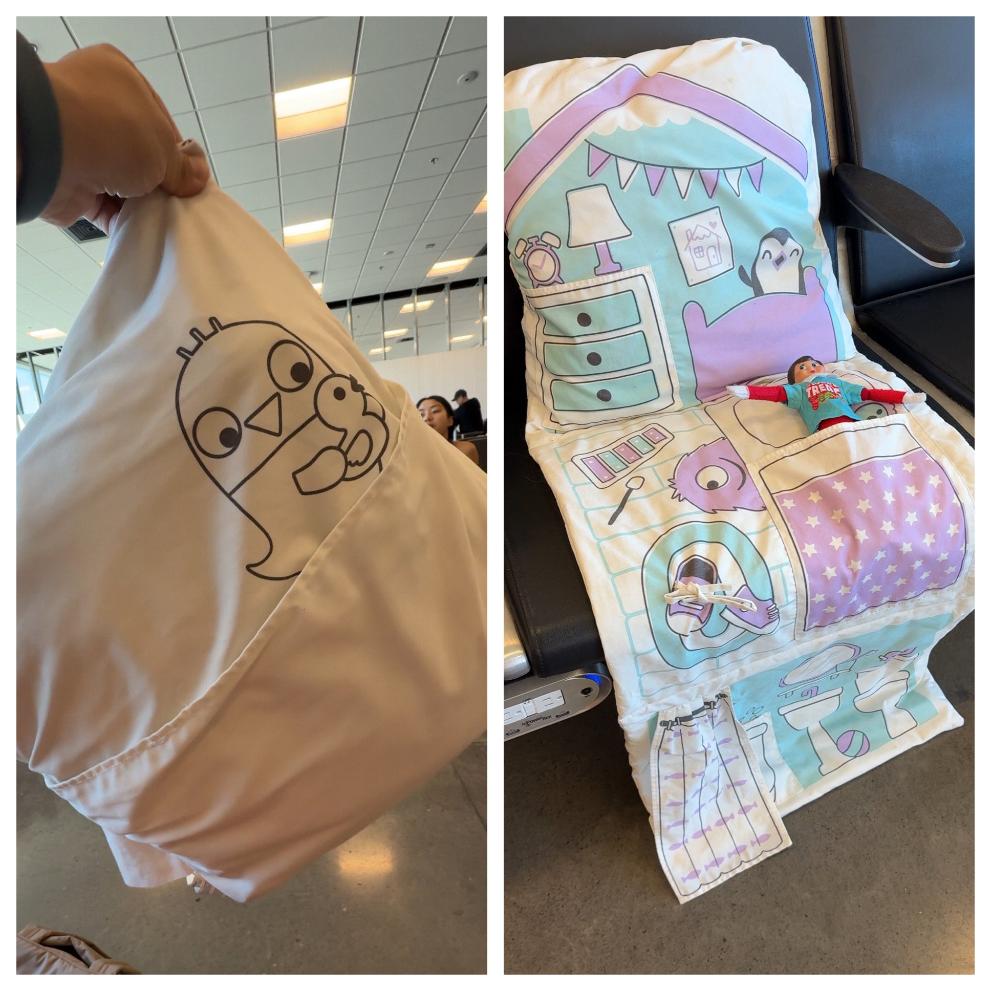 I absolutely love this Sago pillow! Not only is it super comfy for long flights, but it also doubles as a toy to keep your toddler entertained. It’s a bit bigger to pack, but the multifunctional design and comfort makes it worth it.